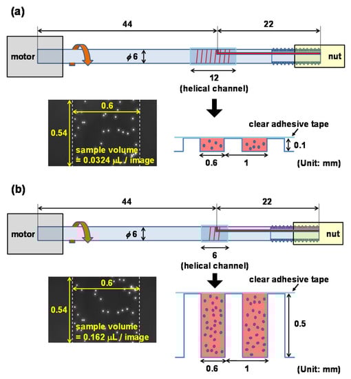 The helical system used herein comprised a two-color fluorescence imaging setup with a Bluetooth-controlled DC motor system, as shown in Figure 1a. For spinning, the helical channel was attached to a DC motor with an encoder for improving control of the spin speed. The DC motor was controlled by an Arduino board with a Bluetooth shield so that the spin speed and time could be controlled over a Bluetooth connection using a smartphone, as shown in Figure 1b. Camera focus was adjusted from above to observe particle position and confinement state. The particles were visualized horizontally using a 10× objective lens (0.3 NA) and a CCD camera (DMK23U445, The Imaging Source, Bremen, Germany) at a resolution of 1280 × 960 pixels. A camera synchronized with the motor obtained multiple images consecutively whenever the motor was rotated by 20°. Figure 1c shows the custom-made helical minichannel sample cartridge; its dimensions, cross-section; details are shown in Figure 2. The length and diameter of the cartridge are 66 mm and 6 mm, respectively. The channel width is 600 μm and the channel depth is 100 μm with 12 turns (Figure 2a) or 500 μm with 3 turns (Figure 2b). A screw thread covered by a transparent adhesive film forms a helical minichannel, so that the sample solution can be introduced into the channel through a hole at one end of the channel using a syringe.