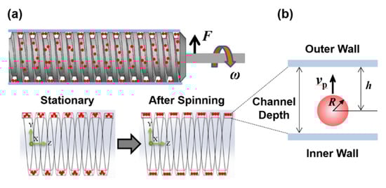 (a) Schematic of particle confinement in a helical minichannel after spinning the sample cartridge; (b) schematic of a particle moving toward the outer wall during spinning.