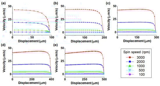 Figure 4 shows the relationship between the particle velocity and displacement from the bottom to the top of the channel as a function of spin speed. The channel depth was varied from 100 to 500 μm in 100 μm steps. For the channel depth of 100 μm, the particle velocity decreased gradually as the particles moved closer to the outside of the channel. However, in channels with channel depths greater than 200 μm, the particle velocity increased and then decreased after reaching a critical point. A threshold was observed at 115 μm below the top of the channel at which the speed decreased for channel depths greater than 200 μm. The reason for the rapid decrease in particle velocity in the proximity of the wall is that the centrifugal force acting on the particles is influenced by the wall of the channel.