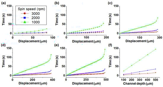 Figure 5 shows the relationship between the rotation time and displacement from the bottom to the top of the channel as a function of spin speed. Compared with the velocity plots shown in Figure 4, the graphs in Figure 5a–e show that the required rotation time increases gradually from the bottom and eventually increases sharply near the top where the velocity decreases abruptly. Further, the greater the channel depth, the greater is the required rotation time. The required rotation time for particle confinement according to channel depth can be obtained from Figure 5f. For instance, when a channel with a depth of 500 μm rotates at 1000 rpm, the rotation time required for the particles to be displaced 485 μm from the bottom of the channel is approximately 145 s.