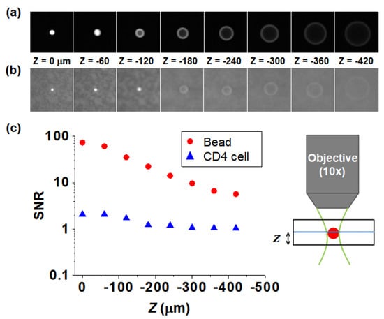 Sequence of particle and CD4 (cluster of differentiation 4) cell images taken at different z-axis offsets using a 10× objective lens; (a) 10-µm fluorescent bead; (b) fluorescently-labeled CD4+ T-lymphocyte; (c) comparison of the signal-to-noise ratios (SNRs) of the fluorescent bead and CD4 cell.