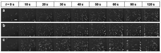 Figure 7 shows particle confinement in the 500-μm-deep channel for a 10% glycerol sample before and after spinning from 0 to 120 s. Figure 7a shows that after filling the channel (stationary at 0 s) no particle confinement was obtained in the channel. When the channel was spun at 1000 rpm for 2 min, the particles moved to the top of the channel owing to centrifugal force; as a result, all particles were observed at the same z-position (the focus). Figure 7b shows a result similar to that obtained in the previous case, where all particles were scattered inside the channel before spinning; however, after the channel was spun at 2000 rpm for 40 s, the particles were confined to the same z-position, having been lifted to the desired position of the outer wall of the channel. Figure 7c shows that at 3000 rpm, particle confinement was achieved more quickly than it was at 1000 rpm or 2000 rpm. The elapsed time for confining particles decreased as the cartridge spin speed increased; however, at 3000 rpm, the particles agglomerated to form clusters. As shown in Figure 7, the elapsed time for confining particles depends on the spin speed.