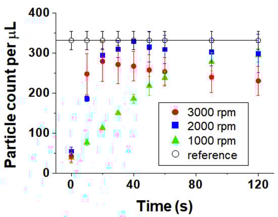 After spinning for 10 s, the number of particles counted increased considerably compared with that before spinning. At the spin speed of 3000 rpm, the number of particles counted increased most rapidly. However, at the spin speed of 1000 rpm, the number of particles increased gradually up to 120 s, converging to a final number of particles similar to the reference value. At the spin speed of 2000 rpm, the number of particles increased gradually up to 40 s and was very similar to the reference value; however, further rotation reduced the particle count slightly because some particles agglomerated and could not be counted individually. At 3000 rpm, the particles moved through the channel the fastest, whereas the number of particles decreased as the rotation time increased because the particles agglomerated rapidly.