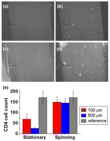 Based on particle confinement results obtained by spinning the cartridge, we applied the method to count CD4 cells using channels with depths of 100 µm and 500 µm. Figure 9a,c show images of CD4 cells before spinning the cartridges for depths of 100 µm and 500 µm. Some CD4 cells were detected at the focal plane, but many CD4 cells remained blurred or undetected. Therefore, CD4 cells are distributed in the height direction of the channel after they are loaded onto it. In Figure 9b,d, after spinning the cartridge at 2000 rpm for 1 min and 2 min, respectively, more CD4 cells are detected in the image. The number of CD4 cells detected per image in the 500-μm-deep channel was approximately 4.89 times the corresponding number for the 100-μm-deep channel. This indicates that cells can be confined and enriched at the focal plane through cell migration by centrifugal force and a larger number of cells detected corresponding to an increased sample volume. Figure 9e compares the CD4 cell count per μL of the 100-μm-deep and the 500-μm-deep channels before spinning (stationary) and after spinning. The cell concentration was measured by counting the total number of cells contained in the helical minichannel. For a channel with a depth of 500 μm, a width of 600 μm and length of 0.54 mm, 0.162 μL of the sample per image can be analyzed. By taking cell images along the channel, 8.7 μL of the sample can be analyzed in total. The total cell counts were 611 and 1465 in the 100-μm- and 500-μm-deep channels, respectively. The reference value is the CD4 count measured using a C-Chip plastic hematocytometer chamber. The number of CD4 cells after spinning the cartridge is similar for both channels and is underestimated by approximately 14% compared with the reference value. This discrepancy could be caused by errors in estimating the channel volume or in analyzing cell images. We anticipate that the accuracy of the CD4 cell count can be improved by more precise fabrication of the helical minichannel and optimized parameters for image processing and analysis.