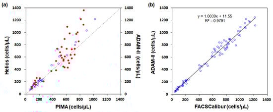 Comparison of CD4+ cell counts in diluted blood samples from human volunteers. (a) Helios and ADAM-II versus PIMA; (b) ADAM-II versus FACSCalibur.