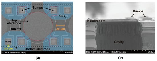 - Liu, W.; He, L.; Wang, X.; Zhou, J.; Xu, W.; Smagin, N.; Toubal, M.; Yu, H.; Gu, Y.; Xu, J.; et al. 3D FEM analysis of high-frequency AlN-based pMUT arrays on cavity SOI. Sensors 2019, 19, 4450. [Google Scholar] [CrossRef]