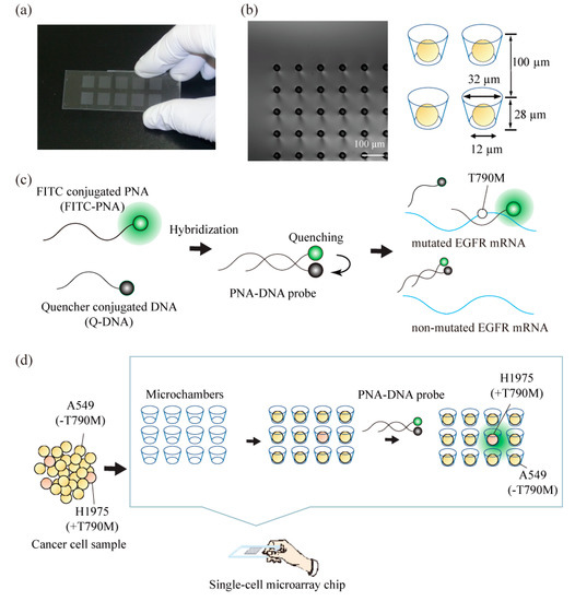 Single-cell analysis offers great potential for understanding the complex biology of various diseases and can also assist with diagnosis. Many single-cell-level analysis tools and systems are currently being developed [1,2,3]. In particular, microchip technology, especially the microchip system for processing cells, called cell chips, could potentially be a powerful tool for the easy, rapid, accurate, and highly sensitive analysis of target single cells that exist within a large number of different cells. Many cell chips with types of microarray [4,5,6,7,8,9] and microfluidic [10,11,12,13] have been reported for single-cells analysis. In particular, cell microarray chips are useful for high-throughput screening and analysis for cells. The fluorescent labeled antibodies [14,15,16,17,18] or fluorescent labeled DNA-based probes [19,20,21,22,23,24,25,26] are commonly used to screen for and analyze target cells. Although these probes have high sensitivity and specificity, it is difficult to detect slightly expressed proteins or the few nucleotide-mutated genes. In addition, it is more difficult to analyze these targets at single cells level. Recently, the screening and detection of anticancer drug-resistant cancer cells harboring single nucleotide-mutated genes has focused on cancer diagnosis [27,28,29]; therefore, we aimed to detect and isolate the single cells expressing the single nucleotide-mutated mRNA from multiple non-mutated cancer cells using our original cell chip technology and peptide nucleic acid (PNA)-based probes with high specificity.