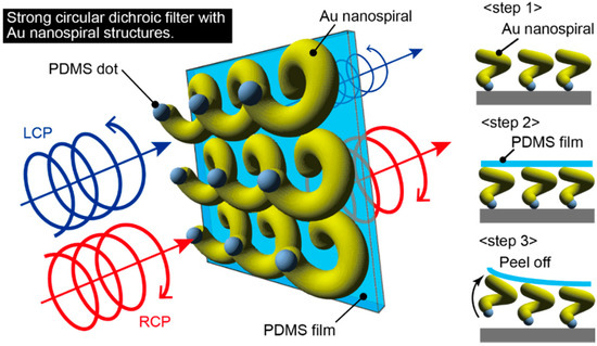 Proposed circular dichroic film at a visible wavelength with Au nanospiral structures transferred on a polydimethylsiloxane (PDMS) thin film.