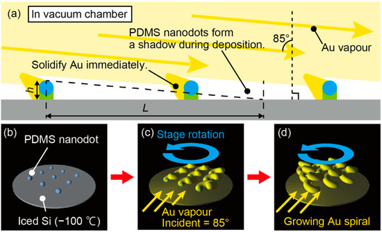 where is the angle at which the Au vapor is irradiated and h is the height of the nanodot. Since the dot template used in this paper is about h = 20 nm, considering the distance that each dot creates a shadow, the of about 80° < < 87° is expected to be suitable and was set to 85°. From the top view, cryogenic glancing angle deposition is performed with the nanodot template Si substrate being slowly rotated against the substrate surface around the vertical axis, as shown in Figure 2b. Then, as shown in Figure 2c, the metal vapor attaches to the apex of the nanodots and consolidates due to the cryogenic condition without relocation. Repeating this process leads to growth of the Au dots into nanospirals, as shown in Figure 2d. In the following, the detailed fabrication process is described.