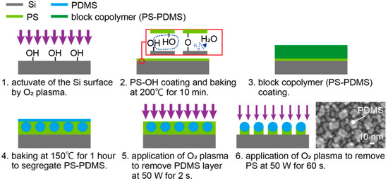 The block copolymer PS-PDMS (P6194-SDMS Mn:47100-b-9000, Polymer Source Inc, Dorval, QC, Canada) and a hydroxy-terminated PS (P2996-SOH, Polymer Source Inc, Canada) were used for the fabrication of the nanodot template. The self-assembly of block copolymers is often used to fabricate nanosized large-area periodic nanostructures such as a nanodot array [29,30,31,32]. In particular, PS-PDMS is adopted in this work because it is advantageous for the fabrication of smaller dot patterns such as on the 10 nm scale [29,31]. Figure 3 shows the fabrication procedure. First, the surface of the Si substrate was activated by O2 plasma at 50 W for 5 min (Figure 3(1)). Then, the hydroxy-terminated PS was adjusted to 1 wt % dissolved in microelectronic-grade propylene glycol methyl ether acetate (PGMEA, Showa Denko, Tokyo, Japan). The hydroxyl-terminated PS was spin coated on the Si substrate at 2000 rpm for 30 s. The substrate was then baked at 200 °C for 10 min in an oven. Since both the surface of the Si substrate and the hydroxy-terminated PS have −OH functional groups, H2O desorbs, and the Si surface and the hydroxy-terminated PS covalently bond with −O− (Figure 3(2)). After baking, the excess PS that did not form a covalent bond was removed by rinsing with PGMEA. Consequently, the surface of the Si substrate was coated with a thin layer of PS [29]. On this substrate, 1 wt % PS-PDMS dissolved in PGMEA was spin coated at 1500 rpm for 30 s (Figure 3(3)) and baked at 150 °C for 30 min in an oven. Upon being baked, PS-PDMS separated into PS and PDMS. The separated PDMS aggregated to form spheres. The size of the PDMS sphere depends on the ratio of PS and PDMS [29,31]. After the separation process, the surface of this film was covered by several nanometer-thick PDMS film because PDMS has the low surface energy [31], and the PDMS spheres were beneath this thin film (Figure 3(4)). The surface PDMS layer is not likely to be affected by the PS-PDMS ratio because it was very thin. The PDMS thin film was selectively removed by O2 plasma at 50 W for 2 s (Figure 3(5)). After removal of the surface PS thin film, the PS between the PDMS spheres was etched with O2 plasma at 10 W for 60 s (Figure 3(6)). The PDMS spheres were thus exposed, becoming nanodot array templates with a 20 nm diameter. The PDMS nanodots were arranged at a pitch of 40 nm, as shown in the SEM (scanning electron microscopy) image of Figure 3(6). In Figure 3(6), although slightly difficult, protruding white dots, which correspond to PDMS spheres, can be observed, and the visible dots other than PDMS spheres are Au spatter grains.