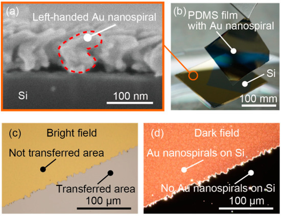 The Au nanospiral structures were then transferred onto isotropic, transparent thin and flexible PDMS thin films to form a film that exhibits transmissive circular dichroism. In the fabrication of the PDMS thin films, the main agent and hardener (Sylgard 184, Dow Corning, Midland, MI, USA) were mixed in a 10:1 ratio and defoamed in a vacuum desiccator for one hour. After defoaming, the PDMS was deposited onto a glass substrate by spin coating at 1000 rpm for 60 s and then heated at 130 °C for 2 h. The PDMS films on glass substrates were cut into 150 mm squares with a scalpel, peeled off, and placed on a Si substrate with fabricated Au nanospiral structures. In general, the bond strength between Au and PDMS is weak, and surface treatment is often performed prior to the transfer of a pattern [33]. However, the Au nanospiral structures could be transferred only by self-adhesion to the surface of the PDMS thin film without such treatment because the PDMS nanodots had weak adhesion to the Si substrate. Applying pressure on the PDMS film to enhance the adhesion between the PDMS film and the Au nanospiral structures was thus not necessary. In this way, a single-layered Au nanospiral-transferred PDMS film was fabricated. The transferred Au nanospirals are shown in Figure 5b. The transferred Au pattern was clearly seen on the surface of the Si substrate, where the Si surface appeared due to the transfer of Au nanospiral structures (Figure 5c). A photo of the substrate after transferred to a PDMS thin film taken with an optical microscope with dark field showed that almost all of the Au nanospiral structures could be transferred to PDMS because a plasmonic red scattered light derived from the Au nanostructures was not observed in the transferred area (Figure 5d). There is possibility that the orientation of the Au nanospiral structures changed during the transfer to the PDMS thin film. This was not an obstacle in the following verification experiments. Because the Au nanospiral structures has chirality even when the orientation changes, the circular dichroism can be observed regardless of the quality of transferal. In a practical use, the orientation will be important. The use of micro transfer printing technique may be promising when transferring the Au nanospiral structure to the PDMS thin film without changing its orientation [34,35].