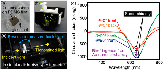 Transmission characteristics when light is incident from the front and back of the device and from the front and back of the device at a 90° tilt. The transmission characteristics of the front and back surfaces at the same angle were almost identical. The circular dichroism measurement error is confirmed by the linearity of the birefringence. (a) PDMS thin film with Au nanospiral structures on a glass cell. (b) Glass cell holder and tilt angle of the glass cell. (c) Setup of the circular dichroism measurement. (d) Circular dichroism spectrum of the device which has left-handed Au nanospiral structures for front side and back side illumination with θ = 0° or 90°.
