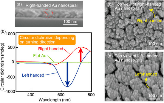The Au nanospirals with reverse winding directions had opposite polarity circular dichroism to each other, meaning that the filter has chirality. (a) SEM image of a side view of the right-handed Au nanospiral structures with a diameter of 50 nm on a Si substrate. (b) Circular dichroism spectra of the right- and left-handed Au nanospiral structures and a flat Au film. (c) SEM image of a top view of the right-handed Au nanospiral structures. (d) SEM image of a top view of the left-handed Au nanospiral structures.