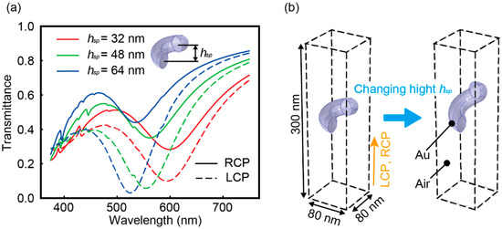 The circular dichroism spectra of the right- and left-handed Au nanospiral structures, which were prepared by changing the rotation direction during cryogenic glancing angle deposition (Figure 5a and Figure 7a), are shown in Figure 7b. Figure 7c is an SEM image of a top view of the right-handed Au nanospiral structures. Figure 7d is an SEM image of a top view of the left-handed Au nanospiral structures. The top view images indicated that the structures are moderately curing. Their curling direction are reversed between the Figure 7c,d, which are corresponding to the handedness of the nanospirals. As a control, the data for a flat Au film with a thickness of 30 nm are also plotted. The flat Au films were fabricated under almost the same conditions as when fabricating the Au nanospiral structures, but the Si substrate did not have a nanodot template and evaporation was performed at room temperature. The flat Au film was almost uniform because a plasmonic red scattered light derived from the Au nanostructures was not observed in the surface with an optical microscope with dark field. No circular dichroism was observed for the flat Au film. Distinctively large circular dichroism was observed for the Au nanospirals. Moreover, the Au nanospiral structures with the opposite handedness exhibited opposite polarity circular dichroism. This result is consistent with the fact that these films had opposite chirality. The amplitude of the circular dichroism for the left-handed Au nanospiral structures showed a negative value peak of −830 mdeg at the 630 nm wavelength. In contrast, the right-handed Au nanospiral structures exhibited a positive value peak of 518 mdeg at 742 nm. Although the peak polarity reversed depending on the chirality of the nanospiral structures, the peak wavelength positions were not the same. This difference can be attributed to the fluctuation of the deposition rate of Au. In the constructed vacuum evaporation system, a deposition rate control system was not installed, so open loop rate control was adopted. Therefore, a slight difference in the deposition rate might have resulted in a spiral height difference between the right- and left-handed spirals, thus producing different resonant frequencies and deviation of the peak wavelengths. The reason why the right-handed Au nanospiral structures, which were smaller in size than the left-handed ones, had a peak on the longer wavelength can be attributed to the height difference of the structure. Figure 8a shows the calculated transmission spectra of the Au nanospiral structures as a function of height of the structure. The simulation was performed using COMSOL Multiphysics 5.5. One unit cell of the Au nanospiral structure is modelled with periodic boundary conditions to simulate an infinite 2D array (Figure 8b). The dielectric constant of Au was defined as a function of the Lorentz-Drude model, and the dielectric constant of air was set to 1 [38]. The size of the unit was set at 80 nm × 80 nm × 300 nm. This corresponds to the Au nanospiral structures spaced 80 nm apart in a 2D plane. The shape of the Au nanospiral structure was as follows. The number of turns was 0.8. The diameter of the rolls, which is the diameter of the nanospiral seen from the infinitely distant point in the longitudinal direction, was 40 nm. The cross section of the nanospiral wire was determined to be circular and the diameter of the wire width was 30 nm. The turning pitch, which is the longitudinal distance for the spiral to take one turn, was 40 nm. The height of the structure was denoted as hsp, and was 0.8 times of the turning pitch. The RCPs and LCPs were illuminated through the lower port of the unit cell and the transmitted light intensity was acquired at the upper port of the unit cell. The changes in transmission spectra were investigated by varying only the structural height hsp (Figure 8b). As hsp increased, the peak wavelength tended to become shorter. This result suggests that the right-handed Au nanospiral structures, which is lower in height than the left-handed ones, had a peak at longer wavelength because of the relatively low height of the structures. As described above, the peak wavelength of the transmission spectrum may change due to changes in the height of the Au nanospiral structures, which is presumably due to difference in the deposition rate. Since this problem can be solved by monitoring the deposition rate, improvement of the evaporation system will solve it. The maximum circular dichroism amplitude obtained in this study, −830 mdeg, is comparable to the results in a previous study [18], where circular dichroism of ~2 deg was observed for chiral meta-fluids with an optical path length of 1 cm. The thickness of the active layer with respect to the circular dichroism of the proposed spiral-transferred PDMS film was only approximately 100 nm, so the Au nanospirals transferred onto the PDMS film were confirmed to exhibit significantly large circular dichroism per medium thickness at visible wavelengths.