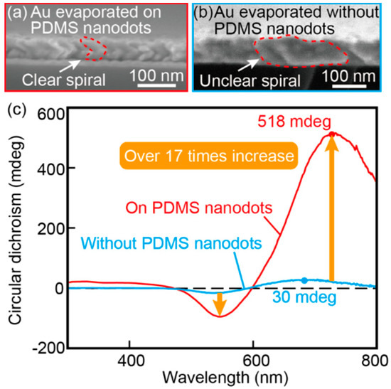 Furthermore, Au nanospiral structures fabricated with and without a dot template were transferred onto PDMS thin films, and their transmission characteristics were measured to investigate the role of the nanodots in generating circular dichroism (Figure 9). Figure 9a,b shows SEM images of a side view of Au nanospiral structures before transferred to a PDMS film. Figure 9a shows Au nanospiral structure with the nanodot template and Figure 9b shows Au nanospiral structure without the nanodot template. From Figure 9b, we can see that under the condition without the nanodot template, many structures are connected to each other and do not form clear nanospiral structures. In the absence of the nanodot template on substrate, Au tended to form a continuous film because Au particles which formed on the substrate as the vapor solidified with very small diameter at random locations were less likely to shadow each other. In both cases, stronger circular dichroism than those natural materials was observed [2,3]. However, the film fabricated with the nanodot template showed over 17 times stronger circular dichroism than the non-template film. These results indicate that the nanodot templates assisted the formation of fine Au nanospiral structures, providing strong circular dichroism.