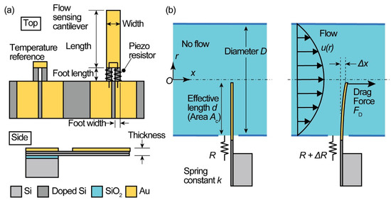 With the advancement of microfluidics, technology to continuously measure microfluidic flow is significantly important in various fields [1,2,3,4,5]. Among these technologies, microelectromechanical system (MEMS) flow sensors are suitable for microfluidics because they can measure minute flows, and their small sensor size permits a direct integration into small fluidic channels [6]. Thermal-type sensors are the mainstream of small MEMS flow sensors, which involve placing a hot wire in a flow and measuring the flow rate based on the amount of heat carried by the flow [7,8,9,10,11]. A thermal MEMS sensor is highly sensitive and can be miniaturized. However, the heat generated on the wire could damage solutions containing biological samples. In contrast, measuring the flow rate based on the drag force of the fluid using a MEMS force sensor is a promising technique because in principle the sensor does not interact with the biological sample [12,13,14,15,16,17,18,19,20]. For the sensitive flow rate measurement, a MEMS force sensor-type flowmeter involves placing a cantilever in the flow path and detecting its strain caused by the drag force. Some MEMS force sensors detect the strain in an optical way; a shift of the reflected laser spot position or deflected cantilever’s optical image itself were used to detect the flow [13,14]. The other sensors mainly detect the strain as a resistance change electrically by means of a piezoresistor formed on the cantilever, this approach having the advantage of facilitating the miniaturization of the sensor configuration. For example, paddle-like shaped cantilevers equipped with piezoresistors on the cantilever roots were employed to detect the force by the flow [12,18]. Self-bended cantilevers were also employed to effectively detect the flow force [15,18]. In addition to the simple flow rate measurement, piezoresistive cantilever typed flow sensors were applied for viscosity sensing [19] or even a bio-logging application of seabirds [16]. The addition of some structures, such as bristles [17] and pillars [20], was performed to improve the sensor performance. Among them, since the piezoresistance also changes according to the temperature conditions around the sensor, temperature compensation is required to precisely measure the flow rate. Conventionally, a dummy piezoresistor on a thick sensor board has often been employed [12,15,20,21,22,23]. However, the temperature environment would be different between the cantilever protruding into the space and the piezoresistor on the substrate; thus, constructing a dummy piezoresistor in the form of a cantilever for accurate flow sensing is desirable.