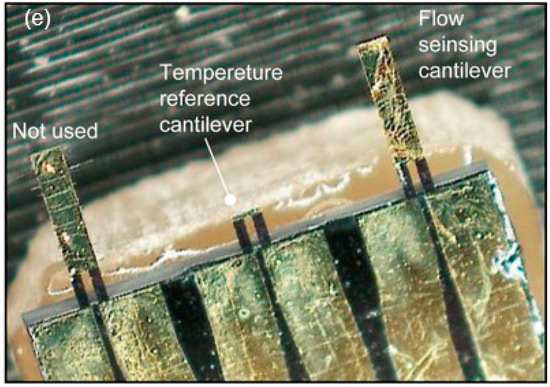 The fabrication process of the piezoresistive cantilever is shown in Figure 2a–d. The cantilever device was fabricated by a standard bulk micromachining process. In the process, a p-type silicon-on-insulator (SOI) wafer (5 μm device Si layer, 2 μm SiO2 layer, and 300 μm handle Si layer) was used as the starting material. The fabrication process is described in previous studies in detail [17]. First, an n-type piezoresistor was formed on the surface of the device Si layer by rapid thermal diffusion (Figure 2a). The doping concentration was approximately 1020 cm−3. Second, an Au layer was deposited on the doped Si surface and patterned to form electrodes (Figure 2b). Au was also deposited on the cantilever itself so that only the cantilever root with two legs worked as a piezoresistor. Then, the device Si layer was also etched with inductively coupled plasma reactive ion etching (ICP-RIE). The Au layer was etched again (Figure 2c). The handle Si layer was etched from the backside with ICP-RIE, and the SiO2 layer was etched with HF vapor (Figure 2d). In this way, the free-standing MEMS piezoresistive cantilevers were fabricated. The resistance of both the fabricated flow sensing and temperature reference cantilevers was approximately 1 kΩ. The fabricated cantilevers bonded on a printed circuit board are shown in Figure 2e. The doping impurity concentration using the same thermal diffusion process has been reported elsewhere to be around 1020 cm−3 [30].