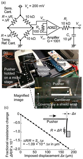 Figure 4. Measurement of the electrical characteristics of the MEMS cantilever-type force sensor. (a) Electrical circuit diagram for the strain measurement, (b) an experimental setup for pushing the cantilever, and (c) the displacement and measured fractional resistance change.