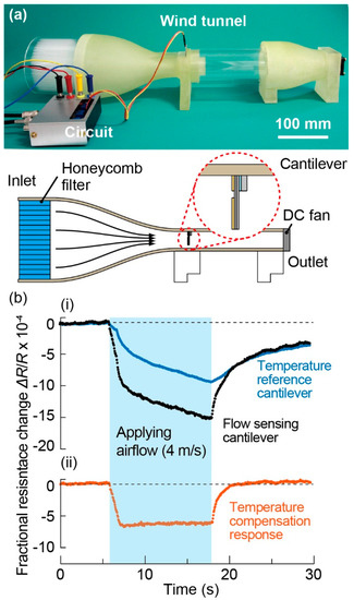 Figure 5. Temperature compensation effect. (a) A photograph of a wind tunnel used to verify the temperature compensation effect. (b-i) Fractional resistance changes of the flow sensing cantilever and temperature reference cantilever when applying an airflow velocity of 4 m/s in an airflow tunnel. (b-ii) Temperature compensation response calculated using both responses.