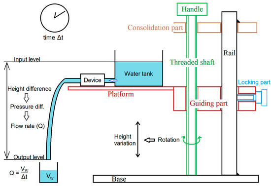 Microflow rate detection experiments were performed. As a driving force of the microflow, gravity was adopted. The pressure resulting from the height difference between the wafer surface of a tank and a tube exit provided a stable water flow (Figure 6). To keep the water surface height constant and remove fluctuations in the flow rate, a large water tank was used. The height difference could be changed by rotating the threaded shaft. It translated a guiding part and a platform, on which the water tank located. The locking part fixed the height of the guiding part. In the experiment, water flow disturbance due to the insertion of the sensor was not observed. The flow rate Q was calculated by dividing the quantity of water that flowed from the water tube outlet by the flow time, and the average flow velocity uave was calculated by Q/π(D/2)2, where D was 2 mm. The flow rate was altered by changing the height of the water tank. The assembled sensor was inserted in the water tube, and the amplified output signal was measured by an oscilloscope.