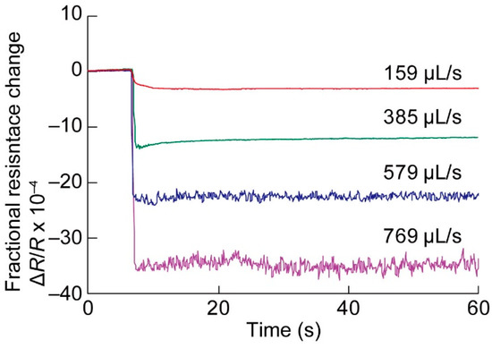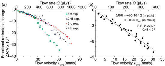 The data obtained for four different flow rates were calculated in the form of ΔR/R, as shown in Figure 7. The voltage Ve applied on the bridge circuit was kept as small as 200 mV to avoid electrolysis and the destruction of the cantilever. With the aid of thermal compensation, the output waveform was uniform without the effect of temperature fluctuations. The output voltage tended to increase as the flow rate Q increased. At lower flow rates such as 159 and 385 μL/s, the resistance changes were almost stably constant. On the contrary, at the higher flow rates, 579 and 769 μL/s, noise on the resistance change appeared, which can be attributed to the vortex around the cantilever or the flutter of the cantilever. The time course data output was averaged, and the fractional resistance changes ΔR/R were plotted with respect to both the flow rate Q and the average flow velocity uave in Figure 8a. The results of four experiments are shown. Since the piezoresistive cantilever was formed on an N-type Si substrate, the resistance decreased when the cantilever was subjected to tensile stress. Thus, the fact that ΔR/R monotonically decreased with an increasing flow rate was a reasonable result. In the lower flow rate range, ΔR/R was almost linear with Q and uave. In the higher flow rate range, particularly over 400 μL/s, the relationship between Q and ΔR/R deviated from the linear relationship. These behaviors can be attributed to the fact that ΔR/R is a quadratic function of uave, as expressed in Equation (3). At a flow rate lower than 400 μL/s, the data presented repeatability. At flow rates higher than 400 μL/s, the fluctuations between the four experiments were large. The increase in fluctuations can be attributed to the disturbance of flow around the cantilever at the higher flow rates, which can be partly seen in the raw data in Figure 8a, where the amplitude of noise in the graph apparently increased for flow rates over 579 μL/s. In addition, the fourth experiment presented a large deviation from the other three experiments. This can be attributed to the experimental setup limitation. In this setup, we employed a silicone tube easily bended due to the inertial force exerted by a fast flow, which would alter flow resistance during the experiment. An improvement of repeatability can be realized by using metal rigid tubes in the setup.