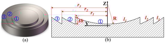 A typical spherical Fresnel micro-structured mold is shown in Figure 1, whose key feature dimensions include the curvature radius R, step height Δh and the total number of circle surfaces b. The cross-section profile of the Fresnel micro-structured mold can be mathematically expressed by Equation (1). From the center to the edge of Fresnel micro-structured mold, the circle surface number is 1, 2… b respectively. The caliber radius ri of the i-th circle surface can be calculated by Equation (2). In order to realize the ultra-precision grinding of Fresnel micro-structured mold, the parallel grinding mode is chosen and a diamond grinding wheel with a sharp edge is used, as shown in Figure 2. A parallel grinding mode has been widely used for the machining of axisymmetric elements [46,47,48,49]. During the parallel grinding process, the grinding wheel and the workpiece rotate at a high speed and low speed, respectively. Through the simultaneous movement of two linear axes, e.g., Y and Z, the grinding wheel continuously feeds from the edge to the center of the workpiece along the planned path. The linear velocity direction of the rotational workpiece and the grinding wheel are parallel at the grinding point [48,49]: