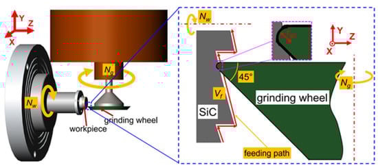 - Ge, C.; Guo, B.; Zhao, Q.; Chen, B.; Wang, J. Precision truing of diamond wheel with sharp edge, Proc. SPIE 9281. In Proceedings of the 7th International Symposium on Advanced Optical Manufacturing and Testing Technologies, Advanced Optical Manufacturing Technologies, Harbin, China, 6 August 2014; SPIE: Bellingham, WA, USA, 2014. [Google Scholar] [CrossRef]
