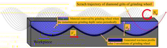 The surface quality evaluation parameters of optical elements include the form error of low frequency, the surface roughness of high frequency and the surface waviness error of intermediate frequency [22,23,24]. The periodic waviness error on the surface of the optical lens will cause reflection and diffraction, affecting the beam focusing performance [25]. In ultra-precision turning, the periodic characteristics of the surface waviness error are closely related to the vibration frequency of the tool and the workpiece [26,27]. Similarly, the surface waviness error is related to the rotation frequency of the workpiece and the grinding wheel in ultra-precision grinding process [28]. Therefore, the ratio of the grinding wheel’s rotation speed to the workpiece’s rotation speed is closely related to the generation of the surface waviness error of the ground workpiece, which is defined as the rotation speed ratio (RSR) [29]. RSR might be integer or non-integer, depending on the selection of the rotation speed of the grinding wheel and the workpiece. When the RSR is not integer, the fractional part of the non-integer RSR is defined as the wave-shift [30].