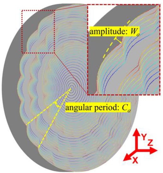 Due to factors such as the random protrusion height of diamond grits, the uneven wear of the grinding wheel and the vibration of the grinding spindle, a certain amount of radial run-out error often exists on the grinding wheel. During the cycles of the grinding wheel’s revolutions, the grits’ instantaneous grinding depth varies periodically because of the radial run-out error, and then the periodically fluctuated surface waviness will be generated on the workpiece along the workpiece linear speed direction, as shown in Figure 3. Obviously, the surface waviness amplitude Wa will not be higher than the grinding wheel’s run-out error ge. Since the tool path of the grinding wheel is a spiral line in a parallel grinding process, the surface waviness appearing on the Fresnel micro-structured mold distributes along its circular direction, as shown in Figure 4. From the edge to the center of the mold, the surface waviness amplitude Wa decreases gradually because of the decreasing workpiece linear speed. Moreover, the angular period Ca is used to characterize the period of the surface waviness.