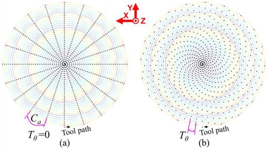 Grinding tool path and the wave-shift value of the Fresnel micro-structured mold: (a) the integer rotation speed ratio (RSR); (b) the non-integer RSR.