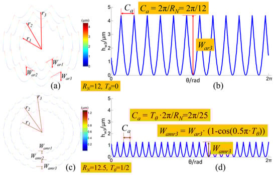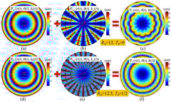 As for the Fresnel micro-structured mold with several circle surfaces, the circular waviness profiles on the edge of each circle surface can be used to characterize its surface waviness distribution condition. When an RSR is integer, the circular waviness profiles can be mathematically described by Equation (11), whose period and amplitude can be calculated by Equations (12) and (13). When RSR is non-integer and the wave-shift value Tθ = , the circular waviness profiles can be mathematically described by Equation (14), whose period and amplitude can be calculated by Equations (15) and (16). Based on the Equations (11)–(16), the circular waviness profiles on the edge of each circle surface of the Fresnel micro-structured mold can be illustrated, as shown in Figure 8a,b and Figure 8c,d, representing the integer RSR and non-integer RSR, respectively.