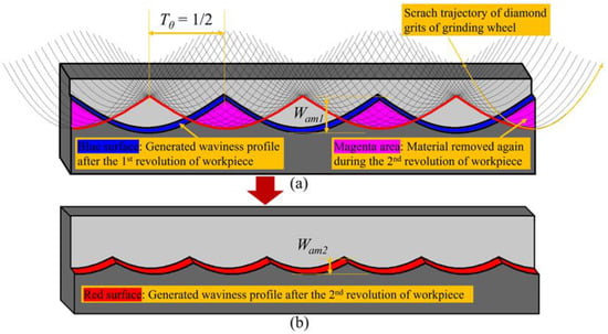 Suppression mechanism of the surface waviness amplitude when using non-integer RSR. (a) removing material again by the secondary grinding zone during the 2nd revolution of workpiece; (b) generated waviness profile after the 2nd revolution of workpiece.