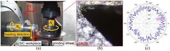 In order to verify the proposed simulation models of the surface waviness topography and the circular waviness profile of the Fresnel micro-structured mold, a series of grinding experiments were carried out. The grinding experiment system was built on a four-axis ultra-precision grinding machine, as shown in Figure 9a. The specific experiment condition was listed in Table 1. Before the grinding process, the upper face and the hypotenuse face of the grinding wheel were conditioned precisely by using a green silicon carbide rod [50,51]. After the conditioning procedure, the edge tip profile of the grinding wheel was copied onto a graphite block and captured by a digital microscope (850×), as shown in Figure 9b. In addition, a laser displacement sensor was utilized to measure the radial run-out error of the grinding wheel and the measurement result is shown in Figure 9c.