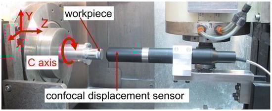 In order to study the influence of non-integer RSR on the surface waviness of the ground Fresnel micro-structured mold, the grinding wheel’s rotation speed was slightly varied to achieve a different wave-shift value, but other parameters were kept constant, as listed in Table 2. After the grinding process, the photos of these ground Fresnel micro-structured molds were captured by another digital microscope (14×). Moreover, the circular profile at the edge of each circle surface of the Fresnel micro-structured mold was measured on-machine by using a chromatic confocal displacement sensor with the C axis mode of the machine tool, as shown in Figure 10.