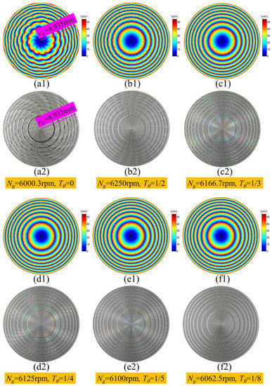Figure 11a1–f1 and Figure 11a2–f2 show the simulation surface waviness topography and the photos of the Fresnel micro-structured molds machined with different wave-shift values, respectively. In general, the simulation results matched well with the experimental results. Both the simulation and experiment results revealed that the surface waviness error was weaker and the surface quality was smoother by using non-integer RSR compared to integer RSR. Among these ground Fresnel micro-structured molds, the surface quality was roughest when Tθ = 0 and smoothest when Tθ = . When the wave-shift value Tθ decreased gradually from to , the surface uniformity was improved and the surface waviness error was suppressed gradually. Therefore, the proposed simulation model of the surface waviness topography was proved to be correct. It should be pointed out that the simulation waviness topography in Figure 11c2–f2 was not clear and obvious when the wave-shift value Tθ equaled,, , and , because the amplitude of the suppressed surface waviness was too low compared to the step height of the Fresnel micro-structured mold.