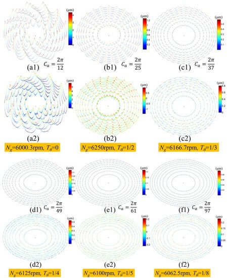 When comparing the simulation waviness topography of Fresnel micro-structured mold in Figure 6b,c and Figure 6e,f, which are machined by using integer RSR and non-integer RSR, respectively, it can be found that the surface quality and uniformity in Figure 6e,f are much better than in Figure 6b,c. Besides, the number of waviness cycles increases from 12 to 25 and the waviness amplitude decreases notably when using the non-integer RSR. In the next section, the suppression mechanism of the surface waviness error of the non-integer RSR will be discussed and the quantitative relationship between the surface waviness features and non-integer RSR will be analyzed.
