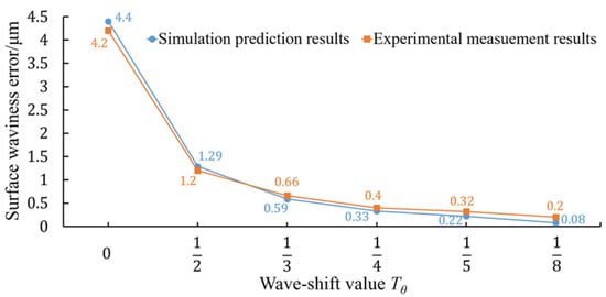 The maximum of the amplitude of the circular waviness profiles of the Fresnel micro-structured mold was used to evaluate its surface waviness error. The varying trend of the surface waviness error of the Fresnel micro-structured mold machined with different wave-shift values is illustrated in Figure 13. It could be found that the simulation results have the same trend as the experimental results, although there existed a small deviation between the two data lines. When the RSR was non-integer, the amplitude decreased gradually with the decrease in the wave-shift value. The experimental results showed that the surface waviness error could be reduced from 4.2 μm to 0.2 μm when adjusting the wave-shift value from 0 to , whose drop rate reached 95%.