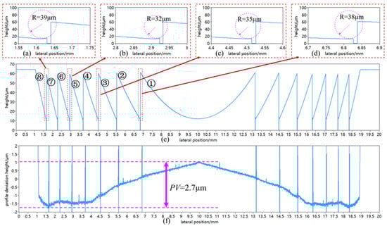 The cross-section profile of the Fresnel micro-structured mold machined by using Tθ = was measured and analyzed, as shown in Figure 14. It is noteworthy that since the vertical side of the valley corner was too steep, no reflected light signal could be received by the chromatic confocal displacement sensor and the output measurement data would be zero. The profile deviation was obtained by calculating the deference between the measurement Fresnel profile and the theoretical Fresnel profile, as illustrated in Figure 14f, the form error PV = 2.7 μm. Moreover, thanks to the suppression effect of surface waviness, the microscopic surface fluctuations in Figure 14f along the diameter of the ground Fresnel micro-structured mold were basically uniform and stable, except for the valley corner area between two adjacent circle surfaces. The valley corner area was affected by the grinding wheel’s edge radius (28 μm), thus generating a curvature. The corner radius was evaluated through the circle-fitting method, as shown in Figure 14a–d. The evaluation results indicate that the corner radius was about 32–39 μm, which was close to the grinding wheel’s edge radius (28 μm), but slightly larger. The reason might be the random distribution of abrasive grits at the edge of the grinding wheel, or measurement errors. To sum up, the measurement results of the circular waviness profiles and the cross-section profile both proved that using the non-integer RSR and proper wave-shift value could significantly suppress the surface waviness error and improve the surface quality and uniformity of the Fresnel micro-structured mold in a parallel grinding process.