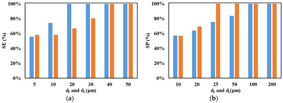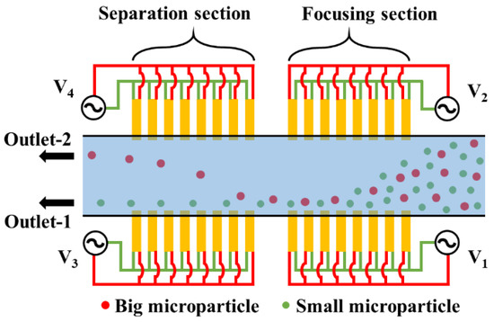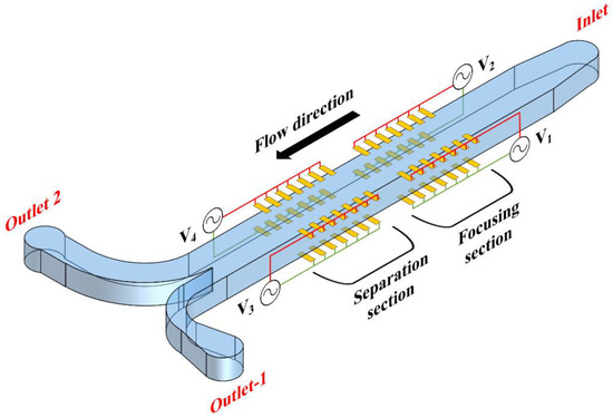 - Lewpiriyawong, N.; Yang, C.; Lam, Y.C. Continuous sorting and separation of microparticles by size using AC dielectrophoresis in a PDMS microfluidic device with 3-D conducting PDMS composite electrodes. Electrophoresis 2010, 31, 2622–2631. [Google Scholar] [CrossRef] [PubMed]