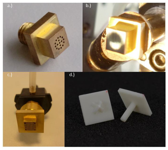 For this reason, special handling tools for a pick-and-place process for ultrathin chips have been manufactured and investigated to avoid damages. Chip detachment tests were conducted with ultrathin thin chips with 30 µm thickness and lateral dimensions of 4.7 mm × 4.7 mm on thermal release foil (Revalpha Tape 3196, Nitto Denko, Osaka, Japan) and a custom-made, heatable metal handling tool (Figure 2a) on a manual assembly machine (Finetech lambda, Berlin, Germany). The ultrathin chips were detached starting at a temperature of 120 °C. The temperature was increased until no further reduction of detachment time could be achieved. An inhomogeneous vacuum area leads to warpage of the ultrathin chips while being handled (Figure 2b). Thus, metal handling tools with a uniform distribution of vacuum channels have been manufactured (Figure 2c). The vacuum area of the tool is designed smaller (4.5 mm × 4.5 mm) than the used chip size (4.7 mm × 4.7 mm) to avoid contamination of the chip surface with adhesives by capillary forces [29].