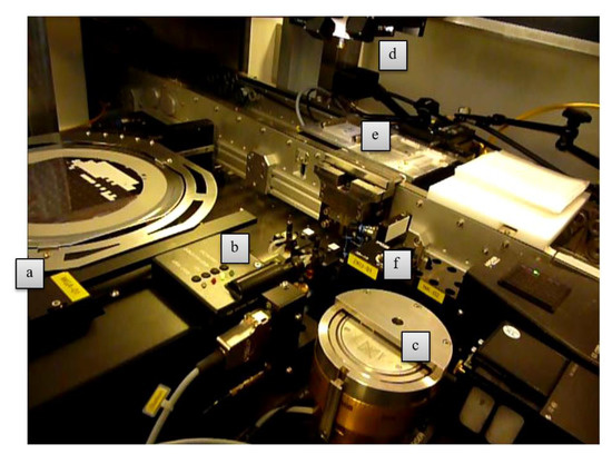 Overview of the assembly machine. (a) Wafer feeder, (b) tool change station, (c) adhesive reservoir, (d) head equipped with a tool, (e) substrate carrier and cooling plate, (f) bottom camera for optical control of lateral and rotational offset of chips on the placement tool.