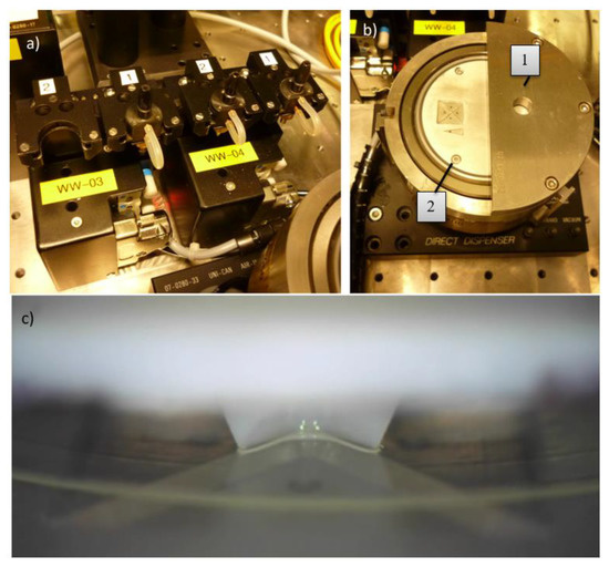 (a) Tool change station. Custom-made tools are integrated into a black-colored adapter and stored in mountings. (b) Adhesive reservoir module. Adhesive is filled into a circular opening (1). A circular mounting (2) with a stretched foil rotates above a metal disk. The adhesive filled into the opening flows onto the stretched foil. The rotational movement of the circular mounting distributes adhesives evenly on the stretched foil. (c) For adhesive transfer, the stamp tool is dipped into the adhesive on the stretched foil.