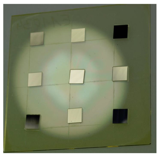 An automatic assembly machine (Type Vico XTec, Haecker Automation GmbH, Waltershausen, Germany, Figure 3) was equipped with two metal tools (Figure 2c) and an additively manufactured stamping tool for epoxy adhesive transfer (Figure 2d). One metal tool was used as heated detachment tool and the other metal tool was used as placement tool. A wafer with ultrathin chips on thermal release foil was loaded into the wafer feeder (Figure 3a) and a substrate was placed onto the substrate carrier (Figure 3e). The equipped stamping tool was checked for correct mounting by image recognition using a bottom camera. After optical check, the stamp was dipped into epoxy adhesive (EPO-TEK 354, Epoxy Technology, Billerica, MA, USA, Figure 4) and then stamped onto the substrate surface. A cross-shaped tool (Figure 2d) showed consistent results with regard to epoxy adhesive volume and its homogeneous distribution on the substrate. The heated vacuum tool detached a chip from the thermal release foil and placed the chip on a flat surface to cool down. The tool was exchanged from a heated tool to a cold placement tool at the tool change station (Figure 4). The cold tool picked up the cooled chip from the storage area. The position and orientation of the chip vacuumed on the placement tool was controlled optically by image recognition of a bottom camera (Figure 3f). This allowed for a compensation of lateral and rotational offset during the placement step after picking the chip off the cooling stage (Figure 3e). A careful placement of the chip onto the epoxy adhesive was realized in three height steps for controlled spreading of epoxy adhesive. At the first step the chip was moved downwards until 200 µm above the substrate for a first contact with the epoxy adhesive. Further, the chip was moved 100 µm/s downwards until 100 µm above the substrate to allow homogeneous distribution of the epoxy adhesive. The remaining 100 µm were moved with the machines’ minimum traverse speed of 20 µm/s until touchdown of the chip on the substrate. The tool was left in touchdown position for 30 s with activated vacuum. Afterwards, the tool vacuum was stopped, finishing the placement process. Using this described process, nine ultrathin chips were placed on epoxy adhesive on a glass substrate with a laser-scribed grid. After placement, the glass substrate was taken out of the assembly machine and placed in an oven at 80 °C for two hours to cure all epoxy adhesive bonds simultaneously, similarly to the procedure with a single chip. It was observed that the chips floated on the liquid epoxy adhesive before the adhesive was cured and solid. This led to misalignment due to missing fixation, as seen in Figure 5.