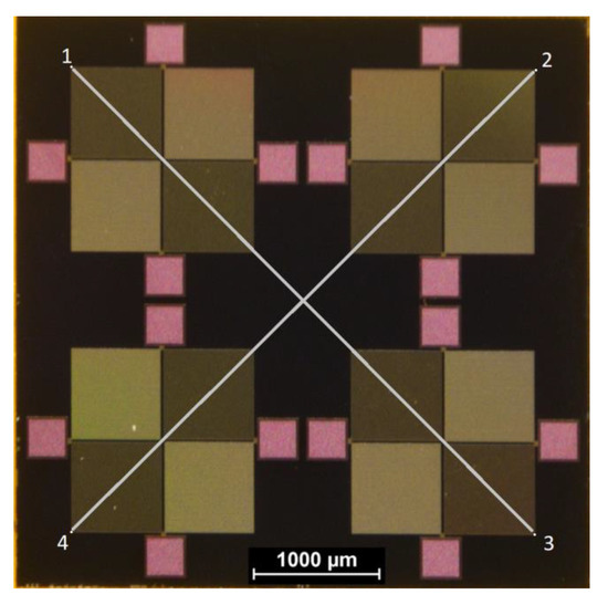 One virtual point was set per Wheatstone structure. For the determination of the chip’s center point, opposite virtual points were connected by virtual lines, as seen in Figure 8. Thereby, the intersection point of the virtual lines defined the position of each chip in the initially set coordinate system on the thermal release foil. These positions were used to calculate the relative placement tolerance between two chips. The rotational misalignment was determined, calculating the angle between the virtual line of the two lower virtual Points 3 and 4 in Figure 8 on a chip and the line between the coordinate system origin and a second reference point on the x-axis of the coordinate system near the edge of the foil.