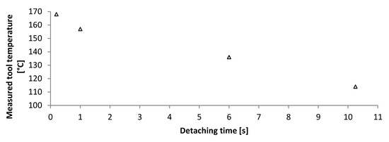Relation between measured tool temperature and detachment time of ultrathin chips from thermal release foil. Temperatures higher than 160 °C ensure quick detachment.