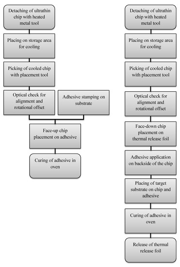 Process flow chart for automated face-up placement of ultrathin chips on stamped epoxy adhesive on the target substrate (left) and automated face-down placement of ultrathin chips on thermal release foil and subsequent application of epoxy adhesive on the backside of the chip (right).