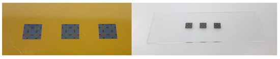 The automated process included the successful detachment of ultrathin chips, stamping of adhesive, and the placement of ultrathin chips on adhesive. Two separated metal tools were used, a heated tool and a cold tool, because tools in this automatic assembly machine could only be actively heated, but not actively cooled. There is the risk of contamination with adhesive of already assembled components if only a heated tool is used for the placement of the chips. Liquid adhesive can squirt out of the adhesive gap due to the decreasing viscosity of the adhesive by increased temperature before curing and the simultaneously rapid expansion of trapped air within the adhesive. If multiple chips are simultaneously cured in an oven, the ultrathin chips need to be mechanically fixated during adhesive curing to avoid misalignment due to floating on liquid adhesive. For this purpose, the chips were automatically placed on adhesive thermal release foil and transferred onto a target substrate using epoxy adhesive. Thereby, adhesive thermal release foil covered the chip surface during the placement of the target substrate on the adhesive. The process flow using the placement of ultrathin chips on epoxy adhesive, as well as the process flow of the placement of ultrathin chips on adhesive thermal release foil, and the subsequent transfer to a target substrate are visualized in Figure 10. Figure 11 shows the successfully conducted process for the target substrates polyimide foil and glass.