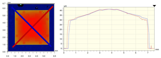White light interferometry of an adhesively bonded 30-µm ultrathin silicon chip on glass substrate (left). The blue and red diagonals on the left side refer to the blue and red graphs on the right side, respectively (right).