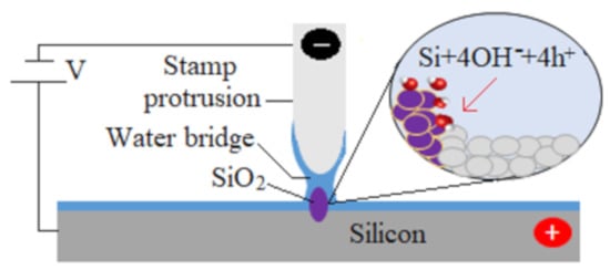 On the other hand, nanoelectrode nanolithography (NEL) has been developed in the laboratory and has been demonstrated as an efficient lithographic tool. This method is based on the spatial confinement of anodic oxidation between a conductive stamp and the specimen surface. When the conductive stamp touches the specimen, a voltage is applied between them. A water bridge is formed between the protrusive parts of the stamp and the specimen. Then the electrochemical reactions occur, which form an oxide film in the touched areas of the specimen. Figure 1 shows the schematic diagram of a NEL process. This method is robust, reliable, and flexible, and has already been effectively used to fabricate nanostructures on different specimens: silicon [16,17,18], GaAs [19,20] and pentacene layers [21]. However, the NEL process with a flat stamp is not suitable for large area nanopatterning as non-uniformity becomes an issue when they use large stamps. Firstly, it is difficult to achieve a uniform contact between the stamp and the specimen on a large-scale due to disuse of the resist materials [16]. Again, another critical challenge in the NEL process is to maintain uniform pressure over the whole contact area during oxidation. These challenges severely limit the application of NEL for large-area nanopatterning.