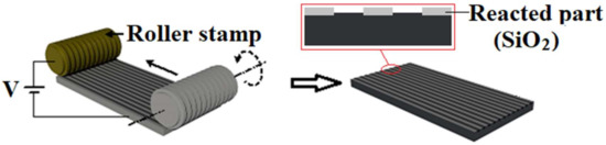 In the R-NEL system, the roller stamp rolls over the specimen while voltage is applied between the stamp and the specimen, which eventually produces continuous oxide patterns (Figure 2). The introduction of the roller is required to maintain uniform pressure over the whole area. Consequently, the local oxidation process can occur uniformly over a large area of the specimens.